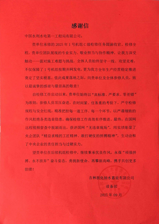 9月24日,機電檢修運維公司承修的吉林敦化抽水蓄能電站1號機組C級檢修工程圓滿完成,機組成功并網發電。 吉林敦化抽水蓄能電站坐落于吉林省敦化市北部,是目前東北地區裝機規模最大、吉林省首座純抽水蓄能電站。該電站總裝機容量達1400兆瓦,共安裝4臺單機容量350兆瓦的可逆式水泵水輪機組,在區域能源系統中發揮著重要作用。 本次1號機組C級檢修工作啟動以來,面對時間緊、任務重的雙重考驗,檢修團隊始終以“高標準、嚴要求、零差錯”為核心準則,頂壓奮進、攻堅克難。施工期間,團隊嚴格遵守檢修規程與安全紅線,對每一道工序、每一個環節進行精準把控,以嚴謹細致的工作作風全面排查并杜絕各類違章隱患,確保檢修工作高效、有序推進。最終,在國家電網公司遠程視頻督查中脫穎而出,成功獲評國網“無違章現場”稱號,同時收到業主單位贈送的錦旗一面與感謝信一封,充分彰顯了業主對檢修工作的高度認可。 此次檢修工程的圓滿完成,不僅保障了1號機組按期并網發電、恢復穩定運行,更為敦化電站全年生產經營目標的穩步推進奠定了堅實基礎。檢修團隊以實際行動,生動詮釋了央企隊伍“精益求精的工匠精神、敢打硬仗的拼搏精神”。 展望后續工作,檢修團隊將繼續傳承優良工作傳統,秉承“頑強拼搏、永不放棄”的優秀作風,以更飽滿的熱情迎接新挑戰,砥礪前行、再創佳績,為能源事業高質量發展貢獻力量! |